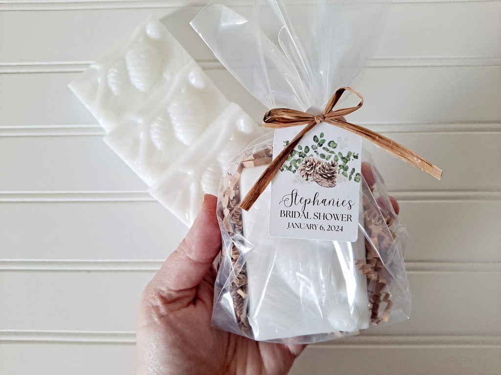 Each pinecone soap is packaged in a cello bag filled with kraft crinkle paper and tied with a kraft raffia ribbon. The custom tag, featuring your chosen text, will be attached to the ribbon. Ingredients and scent details are listed on the back of the tag.