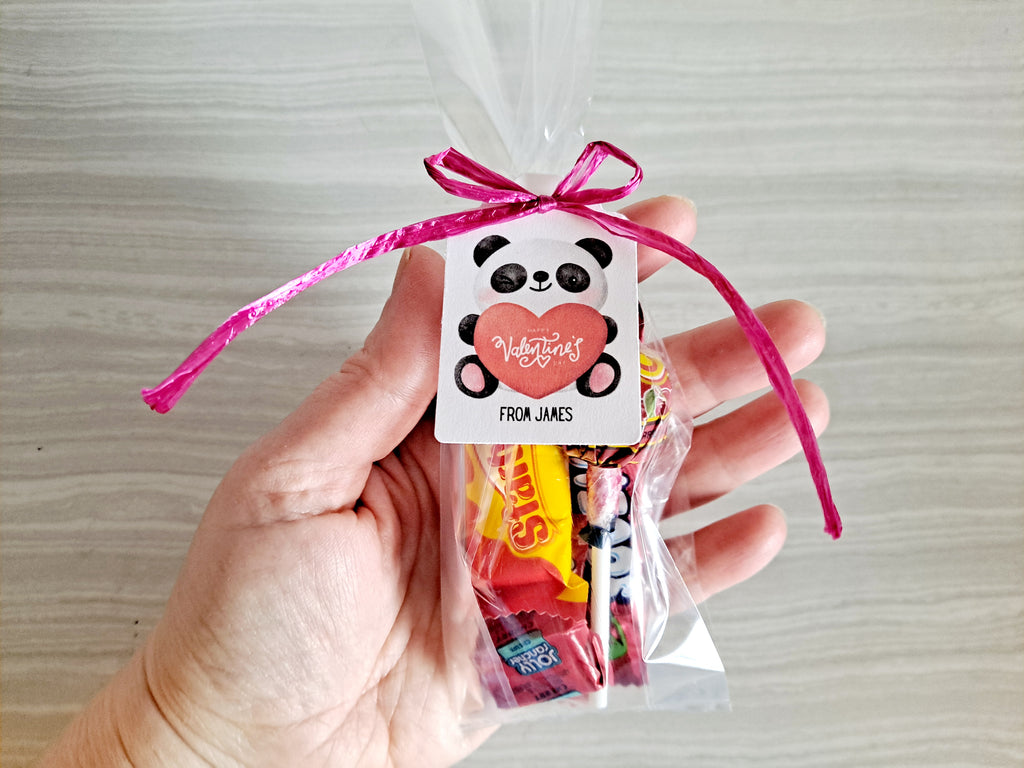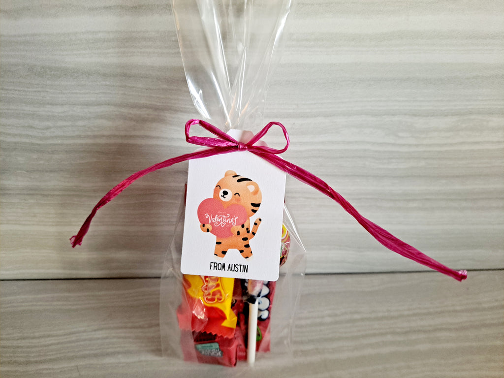 Each candy favor is wrapped in a cello bag and tied with red or pink raffia ribbon. A personalized little gift tag is also included. Please add the text for the tags in the Custom message box.