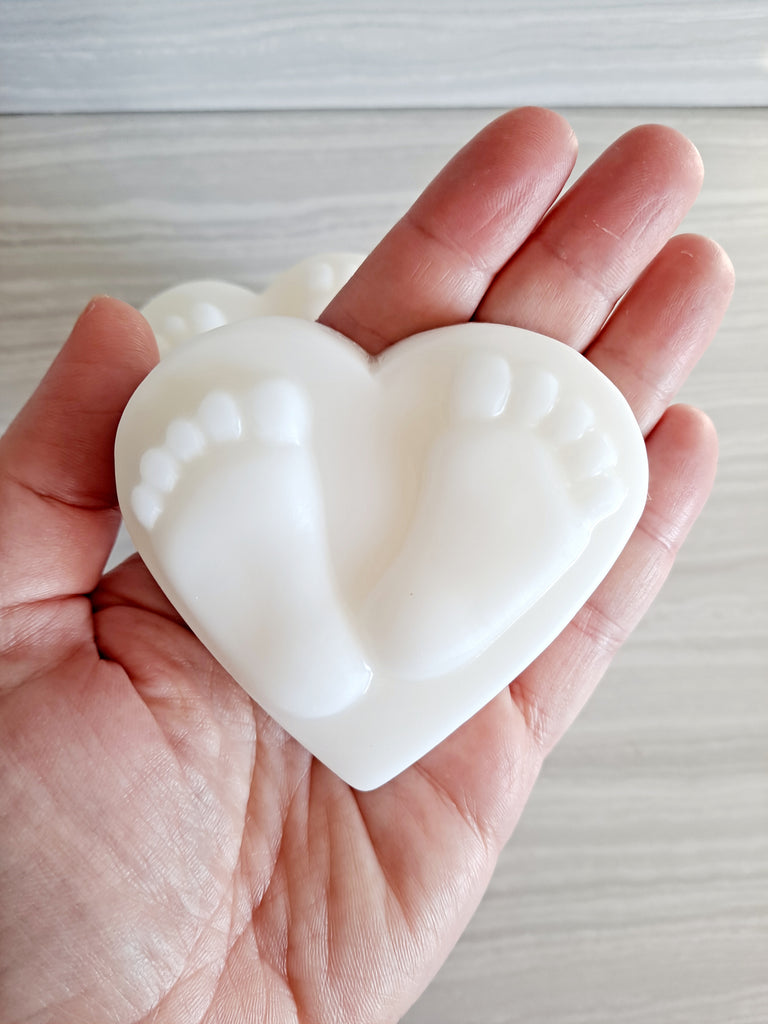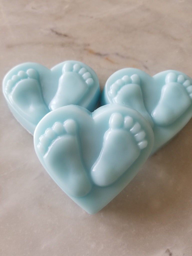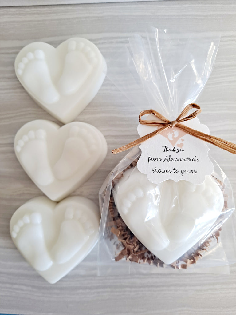 Celebrate your upcoming bundle of joy with these adorable Baby Footprints in a Heart Soap Baby Shower Favors! This listing includes 12 beautifully crafted soaps, each with a unique baby footprint design inside a heart-shaped mold. Our custom tags add a personal touch and make for a sweet and thoughtful thank you gift for your shower guests. Simply add the desired quantity to your cart before checking out. (Example: 1=12, 2=24, 3=36, etc.)