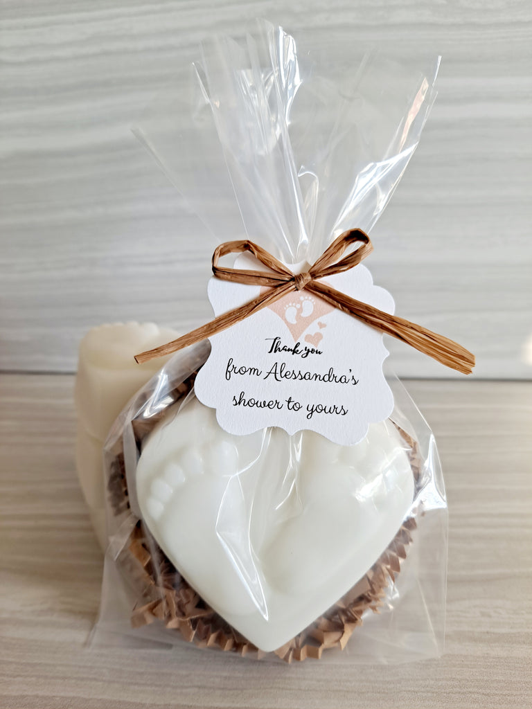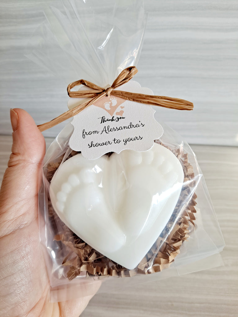 Each soap is individually packaged in a cello bag, filled with kraft crinkle paper and tied with a lovely kraft raffia ribbon. For a personal touch, please include the first name for the custom tags in the Custom Message box. Rest assured, all tags will feature the heart baby footprint design with a "thank you" message.