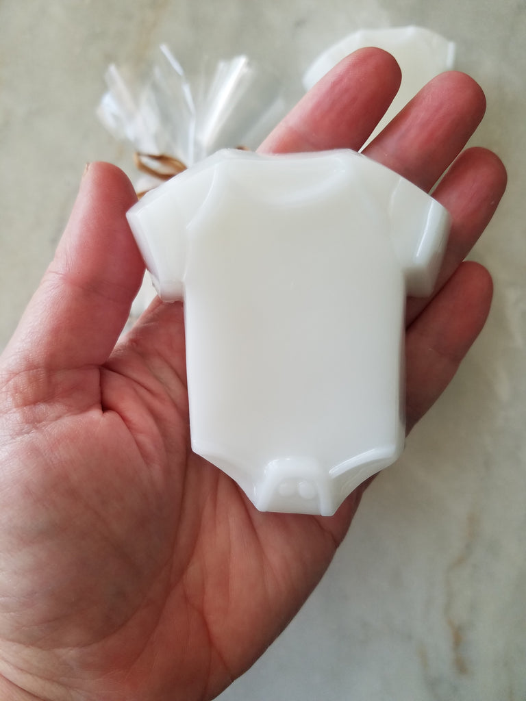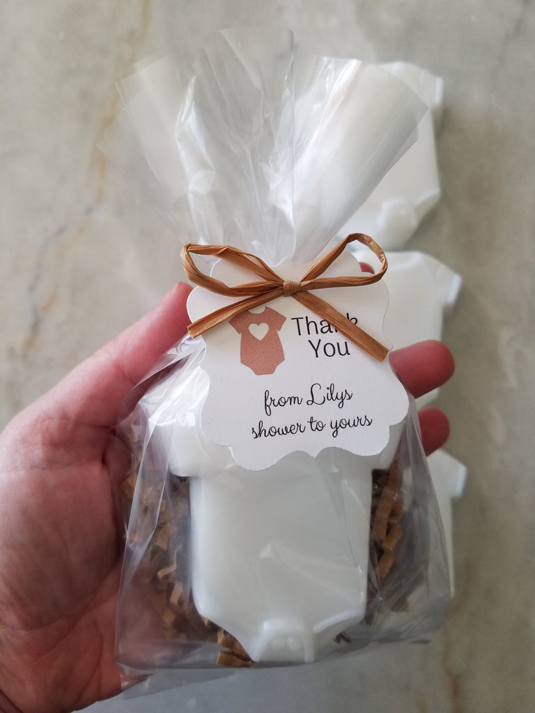 Celebrate your baby shower with these adorable Baby One Piece Soap Party Favors! Each set includes 12 soaps with custom tags, perfect for thanking your guests for their love and support. Simply add the desired quantity to your cart - 1=12, 2=24, 3=36, etc.